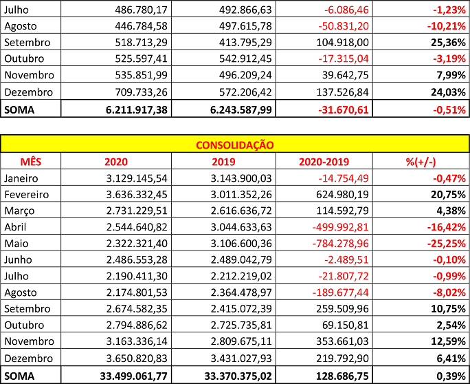 Os quadros colocados a seguir demonstram a situação da arrecadação no exercício financeiro de 2020, fazendo comparativo com o ano de 2019, mês a mês e acumulado no ano.
